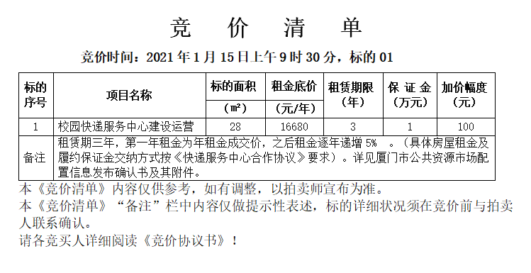 ![]() 嘉泉拍卖有限公司竞价公告 受委托,我司将采用网络竞价方式举办校园快递服务中心建设运营公开招租竞价会: 竞价时间:2021年1月15日上午9:30; 看样时间:2021年1月4日-5日; 报名时间:2021年1月8日09:00-17:00(保证金需在2021年1月6日17:00前到账)。 报名地址:厦门市湖里区云顶北路842号市行政服务中心四楼信息发布大厅21号窗口。(保证金及报名资格等详见厦门市公共资源交易网www.xmzyjy.cn竞价公告) 联系电话:18906019373、18020971805 标的相关资料在厦门市公共资源交易网链接: http://www.xmzyjy.cn/XmUiForWeb2.0/xmebid/dealBid.do?noticeId=4F246E00-BEAE-5C66-8D12-01A8F887C088&projCode=2020SZJJ029¬iceType=1 有关标的信息: